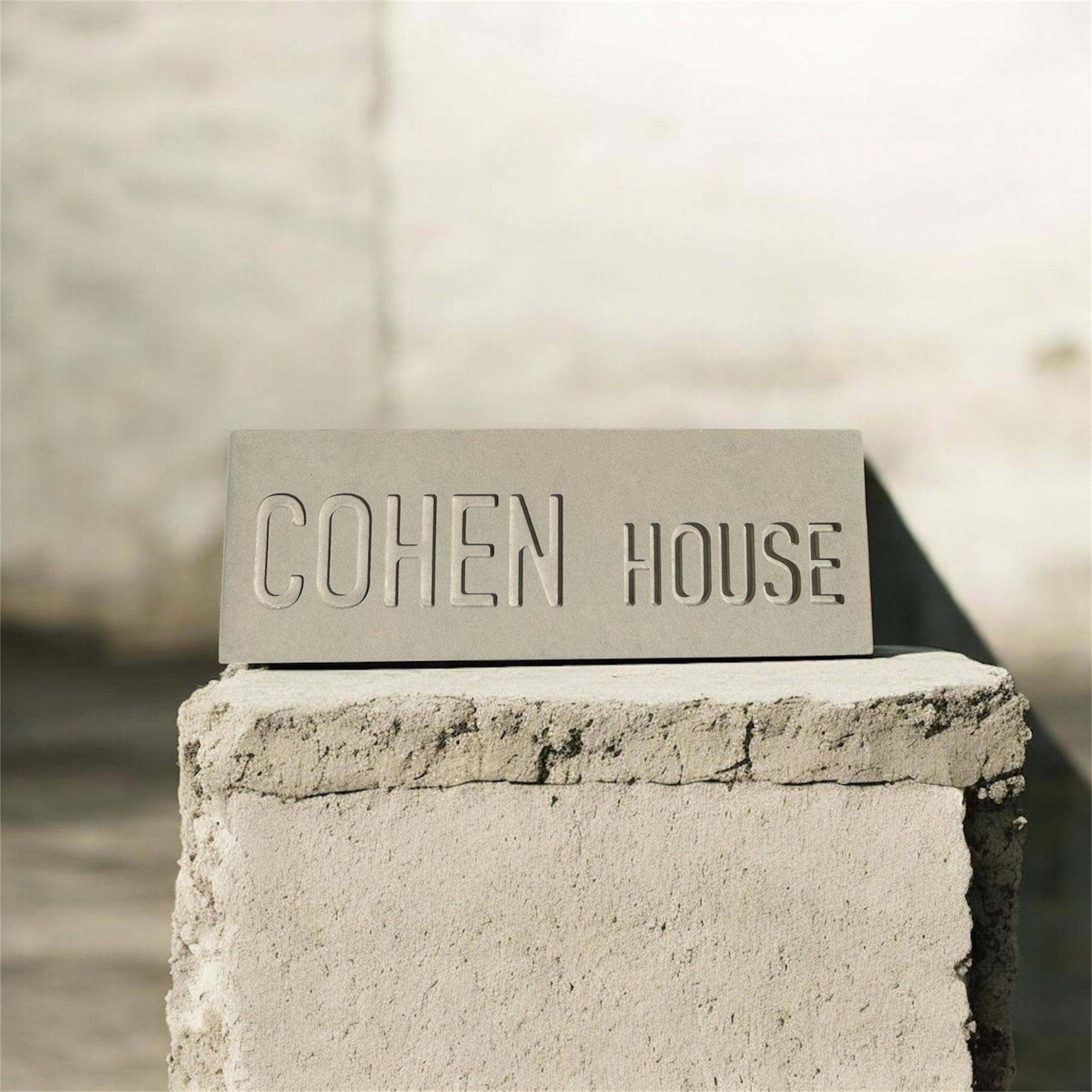 שלט משפחה מבטון בעיצוב מודרני ונקי, בהתאמה אישית עם שם המשפחה וכיתוב House